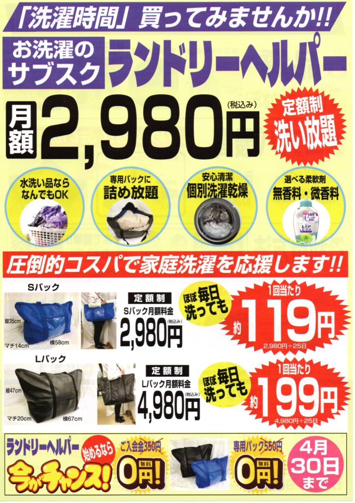 ランドリーヘルパーは普段ご家庭で行う洗濯を代行するサービスです。下着・靴下・Tシャツ・トレーナーなどの水洗い品やバスタオル・シーツなど乾きづらい大物洗濯品を専用のランドリーバックに入れて渡すだけ。プライバシー個別洗濯でお一人様ごとに【洗濯・乾燥・丁寧なたたみ】を施しご返却いたします。「家庭から洗濯機をなくしたい」そんな思いの詰まったサービスです。